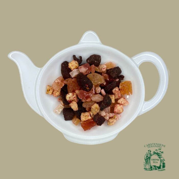 Ingrediens: Sultana rosiner, fersken, kandiseret papaya, kandiseret mango, kandiseret ananas, æble, hindbæ og aroma.